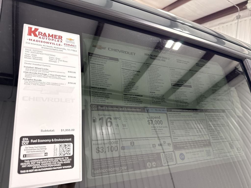 2026 Chevrolet Silverado 1500 LT Trail Boss — 4WD V8 5.3L, located in Madisonville, TX. Ready to conquer work sites, weekend trails, and family drives, this Trail Boss blends serious off-road capability with modern comfort and tech. The 5.3L V8 gasoline engine delivers dependable power and confident towing, while 4-wheel drive takes you where asphalt ends. This Chevrolet Silverado features Remote Start for quick cabin comfort, a Back-Up Camera for confident parking and hitching, Lane Keep Assist and Lane Departure Warning for added highway safety, and Apple CarPlay to keep navigation, calls, and music seamlessly integrated. Trail Boss styling includes rugged stance, upgraded suspension, and bold accents that signal capability without sacrificing refinement. Inside, durable materials and smartly arranged controls support long days on the job and relaxed drives on the weekend. Safety and convenience tech work together to enhance driver control and situational awareness, making every trip easier and more enjoyable. Located in Madisonville, TX and priced to move—this Chevrolet Silverado 1500 LT Trail Boss offers the best price for buyers seeking performance, comfort, and off-road readiness in one package. If you want a powerful V8 truck with 4WD, modern safety systems, remote start, and Apple CarPlay at an unbeatable value, this Chevrolet Silverado is the smart choice. Contact us in Madisonville, TX to schedule a test drive and take advantage of the best price today.