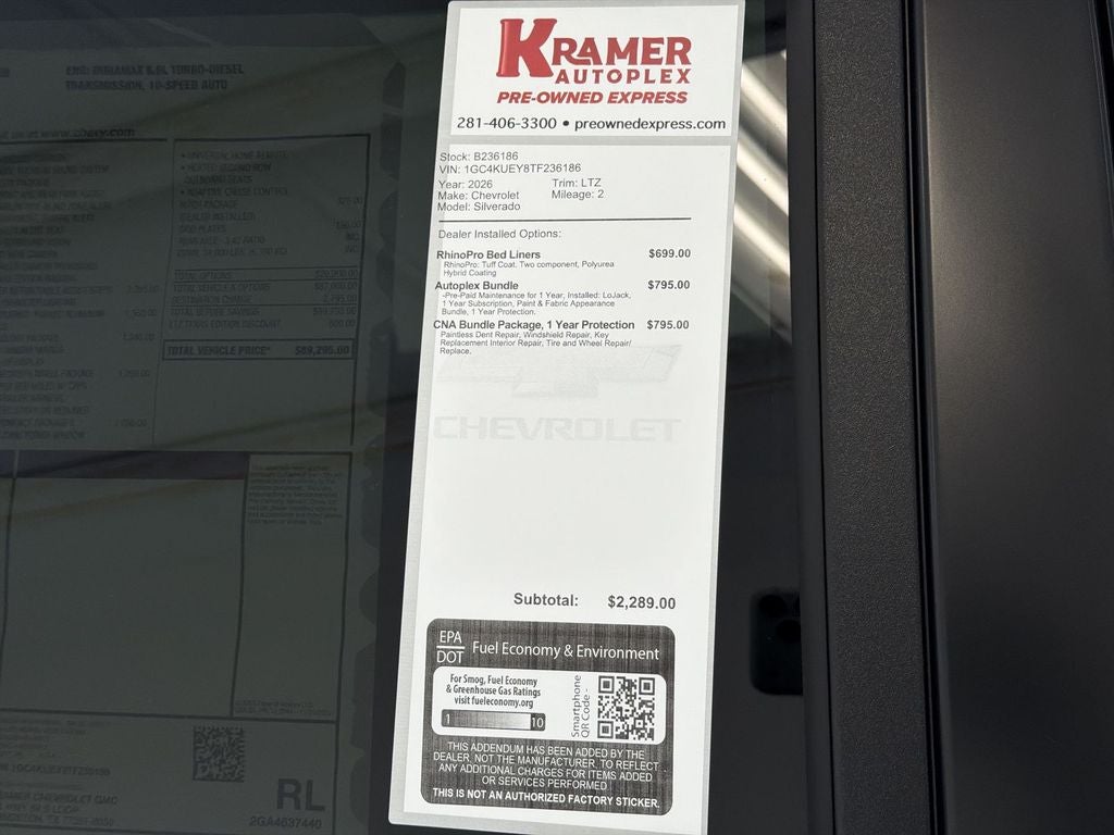 LTZ Convenience Package II: Heated 2nd Row Outboard Seats; Power Sliding Rear Window with Defogger; Universal Home Remote; Adaptive Cruise Control. LTZ Convenience Package: LED Cargo Area Lighting; Ventilated Driver and Front Passenger Seats; Power Tailgate; Bose Premium 7-Speaker Sound System; Floor-Mounted Center Console; Wireless Charging; Front Bucket Seats. Safety Package: HD Surround Vision; Trailer Side Blind Zone Alert; Ultrasonic Front and Rear Park Assist; Rear Cross Traffic Alert; Safety Alert Seat; Trailer Camera Provisions; Bed View Camera with Two Trailer Camera Provisions. Technology Package: Multicolor 15" Diagonal Head-Up Display; Auto-Dimming Inside Rearview Mirror with Camera. Preferred Equipment Group 1LZ: HD Rear Vision Camera; LT275/70R18E AT BW Tires; Chrome Door Handles; Durabed Pickup Bed; Perforated Leather-Appointed Front Outboard Seat Trim; SiriusXM with 360L Trial Subscription; Bluetooth® For Phone; Remote Vehicle Starter System; In-Vehicle Trailering App System; Electric Rear-Window Defogger; Unauthorized Entry Theft-Deterrent System; 170 Amp Alternator; Front