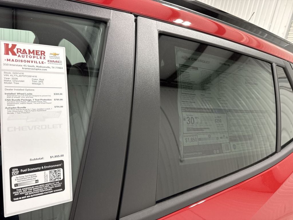 2026 Chevrolet Trax 2RS — FWD, 3‑cyl 1.2L Gasoline — Madisonville, TX Looking for a compact SUV that combines sporty styling, fuel-efficient performance, and modern tech? This 2026 Chevrolet Trax 2RS with a 1.2L 3‑cylinder gasoline engine and front‑wheel drive delivers exceptional value and comfort. Located in Madisonville, TX, this Chevrolet Trax is priced to sell and offers the best price in the area. Comfort and convenience are front and center with leather seats, automatic climate control, and remote start for quick warmups or cool downs. Safety features include Lane Keep Assist and Lane Departure Warning to help you stay centered and relaxed on highways and city streets. The 2RS trim adds distinctive exterior accents and premium interior touches for a sportier look and feel. Ideal for daily commutes, weekend getaways, or city driving, the Chevrolet Trax balances efficiency and capability with nimble handling and modern amenities. Whether you prioritize fuel economy, advanced driver assists, or a stylish small SUV, this Chevrolet Trax checks the boxes. Contact us in Madisonville, TX to schedule a test drive, confirm availability, or learn about financing options. With the best price on this 2026 Chevrolet Trax 2RS, opportunities like this don't last long — act now to secure this exceptional compact SUV.