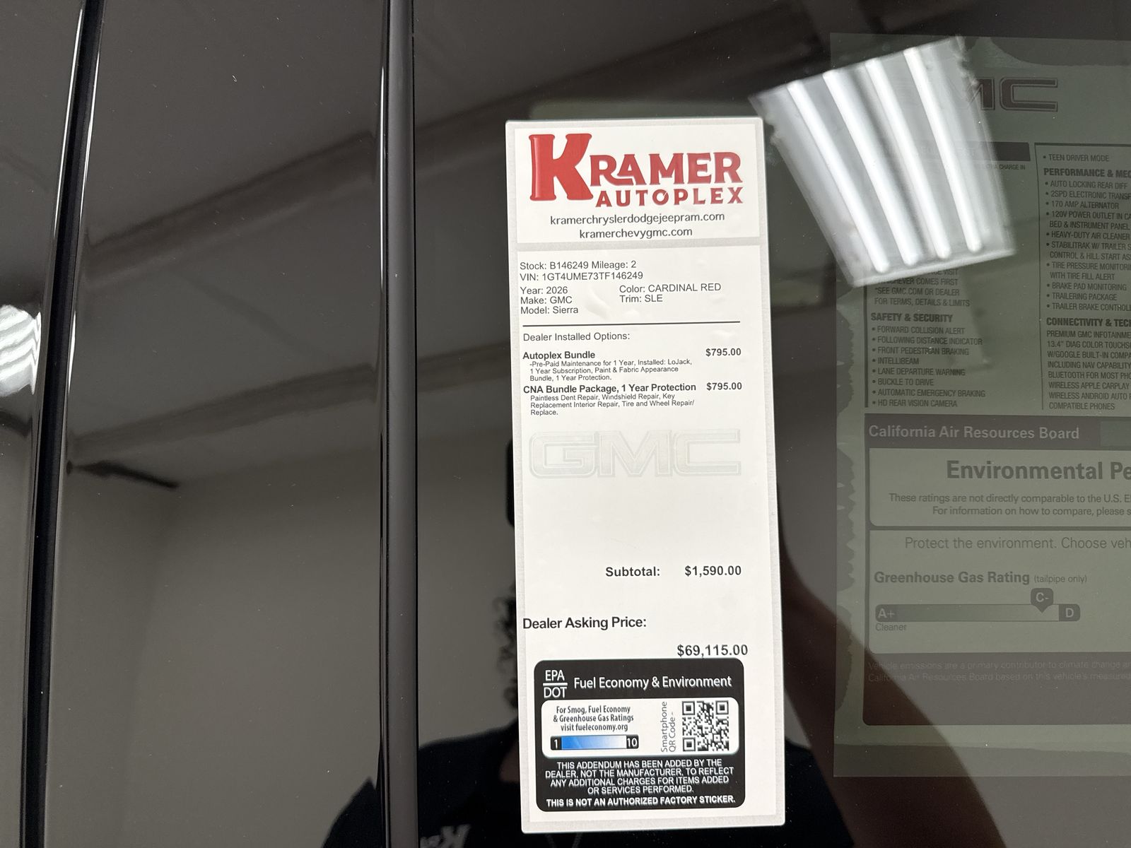SLE Convenience Package: Manual Tilt-Wheel/telescoping Steering Column; 10-Way Power Driver Seat Adjuster with Lumbar; LED Fog Lamps; LED Smoked Amber Roof Marker Lamps; A/C with Dual-Zone Automatic Climate Control. X31 Off-Road Package: Off-Road Suspension; Hill Descent Control; Skid Plates; Off-Road Suspension; Hill Descent Control; LT265/70R17E AT BW Tires; Skid Plates. SLE Value Package: Spray-On Pickup Bedliner with GMC Logo. Preferred Equipment Group 3SA: OnStar Services Capable; 120-Volt Bed Mounted Power Outlet; 4-Way Manual Driver Seat Adjuster; 2-Speed Electronic Shift Transfer Case; SiriusXM with 360L Trial Subscription; Deep-Tinted Glass; 6.6L V8 with Direct Injection and Variable Valve Timing Engine; Chrome Surround Grille with Chrome Insert Bars; Sierra HD Pro Safety; Keyless Open and Start; Wireless Phone Projection; 120-Volt Instrument Panel Power Outlet; Push Button Start; 2 Charge/data USB Ports; Steering Wheel Audio Controls; 2 Charge