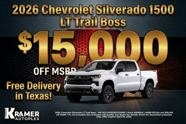 Offer valid on select 2026 Chevrolet Silverado 1500 LT Trail Boss models. MSRP may vary by vehicle. Price does not include TT&L. Not all buyers will qualify. Offer valid while supplies last. Expires April 30, 2026. See dealer for additional details.