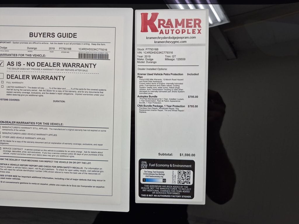 Start the Dodge Durango from inside with remote start. The state of the art park assist system will guide you easily into any spot. Bluetooth® technology is built into this mid-size suv, keeping your hands on the steering wheel and your focus on the road. The Dodge Durango offers Apple CarPlay for seamless connectivity. Protect the Dodge Durango from unwanted accidents with a cutting edge backup camera system. Our dealership has already run the CARFAX report and it is clean. A clean CARFAX is a great asset for resale value in the future. The Dodge Durango comes equipped with Android Auto for seamless smartphone integration on the road. This 2019 Dodge Durango is pure luxury with a heated steering wheel. This model offers Automatic Climate Control for personalized comfort. The leather seats in this mid-size suv are a must for buyers looking for comfort, durability, and style. This model has a V6, 3.6L high output engine.