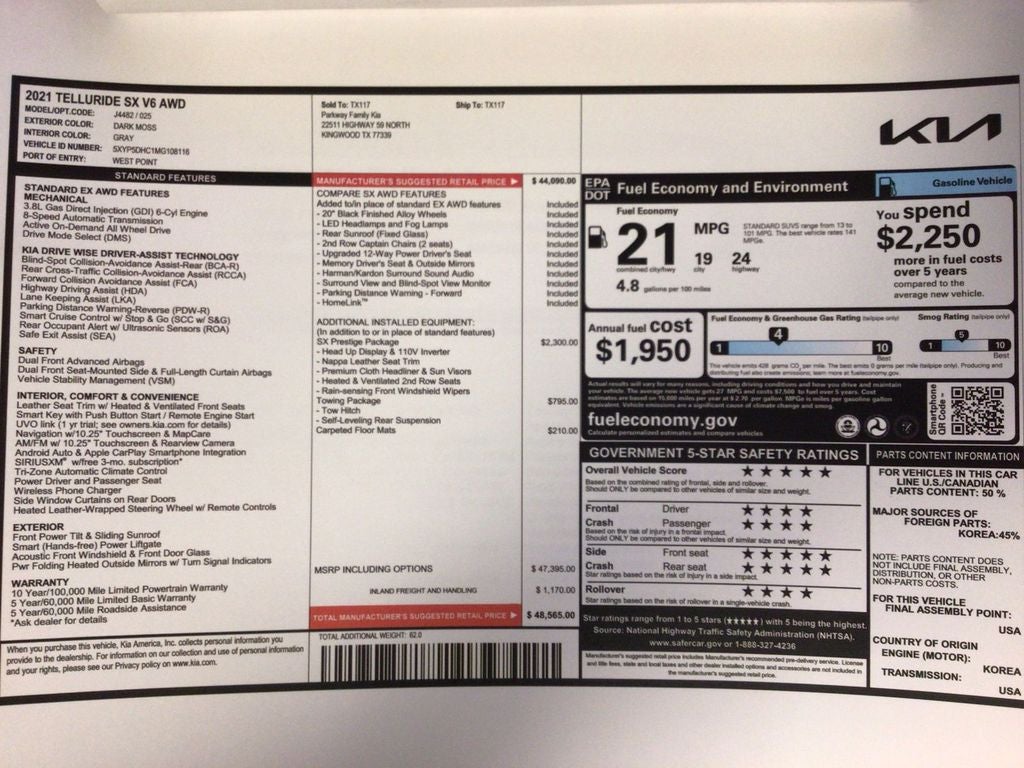 SX Prestige Package: Premium Cloth Headliner and Pillar Trim; 110V Inverter; Premium Nappa Leather Seat Trim; Head Up Display; Heated and Ventilated Second Row Seats; Rain-Sensing Front Windshield Wipers. Towing Package: Self Leveling Rear Suspension; Tow Hitch with Harness. Carpeted Floor Mats. **Equipment listed is based on original vehicle build and subject to change. Please confirm the accuracy of the included equipment by calling the dealer prior to purchase.**