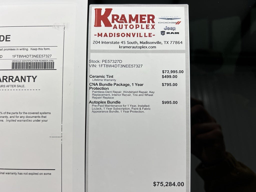 FX4 Off-Road Package: Transfer Case and Fuel Tank Skid Plates; Hill Descent Control; Off-Road Specifically Tuned Shock Absorbers; Unique FX4 Off-Road Box Decal. Lariat Ultimate Package: Power Heated/ventilated Driver Seat with Memory; PowerScope Trailer Tow Mirrors with Memory; Easy Entry/exit Memory Driver's Seat Feature; Tailgate Step and Handle; LED Box Lighting; Intelligent Access with Push-Button Start; Power Heated/ventilated Passenger Seat; Remote Start System; Power-Adjustable Pedals with Memory; Ambient Lighting - Fixed Color; Power Telescoping/tilt Steering Wheel/column; Remote Tailgate Release; Wireless Charging Pad. Order Code 678A: Limited Slip with 4.30 Axle Ratio; 6.7L 4V OHV Power Stroke V8 Turbo Diesel B20 Engine; Front Leather Seating Surfaces 40/console/40; 19.5" Forged Polished Aluminum Wheels; TorqShift 10-Speed Automatic Transmission; 225/70Rx19.5G BSW Traction Tires; 14. 000 Lb Payload Package GVWR; B&O Sound System by Bang and Olufsen. Pro Trailer Backup Assist. Quad Beam LED Headlamps and LED Taillamps. Adaptive Steering. Power-Deployable Running Boards. Adaptive Cruise Control and Collision Warning. Star White Metallic TC. Star White Metallic TC. Tailgate Step and Handle. Customer-Placed Trailer Camera. Remote Start System. Front Wheel Well Liners. Rain-Sensing Windshield Wipers. Upfitter Switches (6). All-Weather Floor Mats. Universal Garage Door Opener (UGDO). Transfer Case and Fuel Tank Skid Plates. LED Box Lighting. **Equipment listed is based on original vehicle build and subject to change. Please confirm the accuracy of the included equipment by calling the dealer prior to purchase.**
