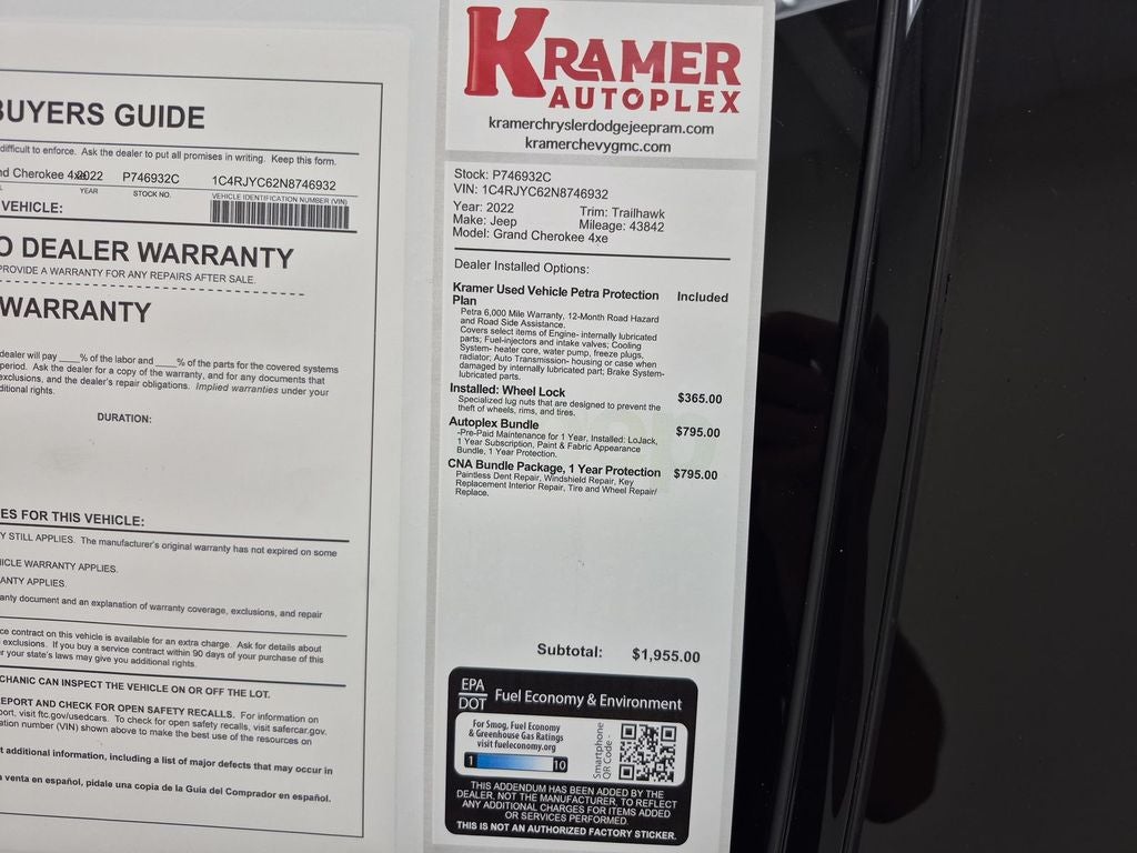 2022 Jeep Grand Cherokee 4xe Trailhawk — 43,842 miles — Livingston, TX Ready for both city streets and rugged trails, this 2022 Jeep Grand Cherokee 4xe Trailhawk blends off-road capability with efficient plug-in hybrid performance. Powered by a 4-cylinder 2.0L PHEV engine and 4WD, it delivers strong torque, excellent fuel economy, and electric-only driving for short commutes. This Trailhawk comes equipped with Android Auto for seamless smartphone integration, Adaptive Cruise Control for highway confidence, and convenient Remote Start to warm or cool the cabin before you get in. The Off-Road Package enhances trail performance with upgraded suspension, skid plates, and specialized drive modes so you can tackle rough terrain with confidence. CARFAX 1-Owner history provides added peace of mind, reflecting careful ownership and maintenance. With premium Trailhawk features and a clean report, this Jeep represents exceptional value and capability. Located in Livingston, TX, this vehicle is competitively priced — offering the best price in the area for a 4xe Trailhawk with these specs and mileage. Whether you need a capable daily driver, efficient commuter, or weekend adventurer, this Jeep Grand Cherokee 4xe Trailhawk is a smart choice. Contact us to schedule a test drive and secure this best-priced Trailhawk in Livingston today.
