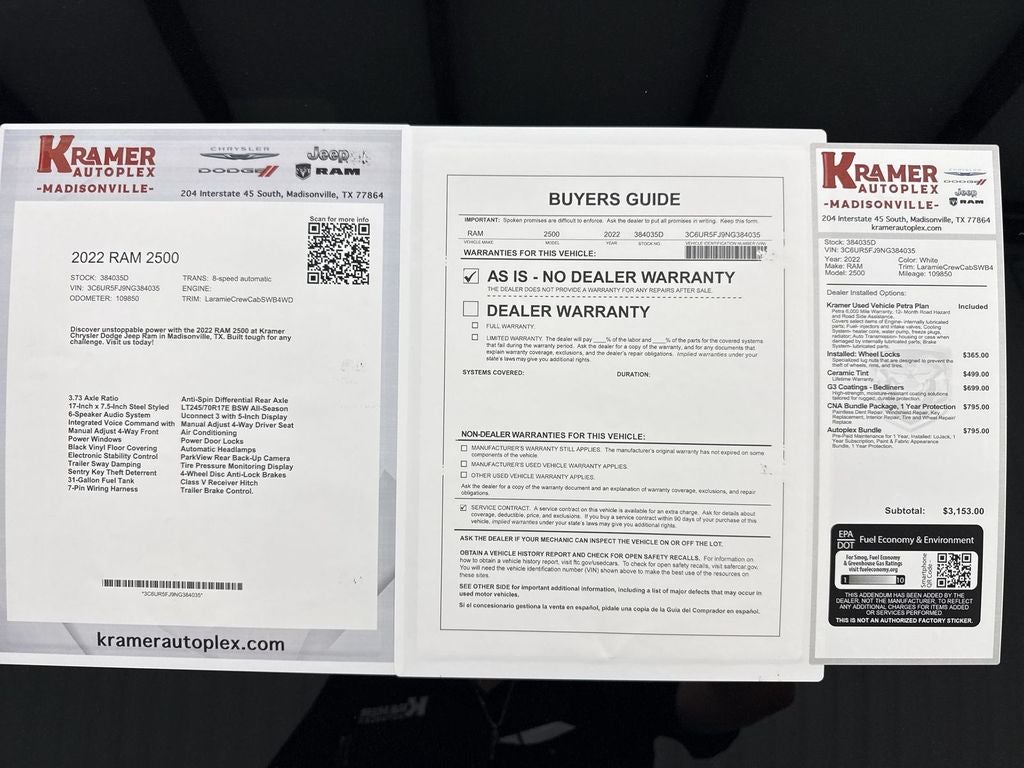 Power, comfort and confidence converge in this 2022 Ram 2500 Laramie 4WD — a commanding V8-powered heavy-duty truck with a 6.4L gasoline engine, located in Madisonville, TX. This Laramie pairs robust capability with premium creature comforts, and it's offered at the best price in the area for buyers seeking serious towing, hauling and daily driving refinement. Inside, experience leather-appointed seating, a heated steering wheel for chilly mornings, and an advanced navigation system that keeps you headed the right way. Stay connected with Android Auto integration and rely on the back-up camera for precise maneuvering in tight spots. The CARFAX Clean Report confirms careful ownership history so you can buy with added peace of mind. Under the hood, the 6.4L V8 delivers muscle for heavy loads and confident highway passing, while 4-wheel drive provides traction when the road gets rough. Thoughtful Laramie details combine utility and style, making this truck equally at home on job sites, ranch roads and family outings. With competitive pricing and exceptional value, this 2022 Ram 2500 Laramie in Madisonville, TX is positioned as the best-priced option for buyers who won't compromise on performance or features. Schedule a test drive today to experience the power, comfort and technology of this Ram 2500 Laramie — serious capability with a proven history and undeniable value.