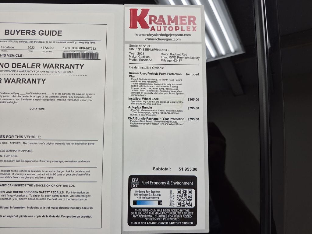 Preferred Equipment Group 1SB: Automatic Seat Belt Tightening; Power Panoramic Tilt-Sliding Sunroof; Mechanical Limited-Slip Differential; Door Lock and Latch Shields; Enhanced Automatic Parking Assist; Lane Change Alert with Side Blind Zone Alert; Rear Camera Mirror Washer; Rear Camera Mirror; Running Board Assist Steps; Heated and Ventilated Driver and Front Passenger Seats; Theft-Deterrent Alarm System; Reconfigurable Full-Color Head-Up Display; AKG Studio 19-Speaker Audio System; Vehicle Interior Movement Sensor; 22" 14-Spoke Alloy Wheels with Polished Finish; Rear Cross Traffic Alert; Vehicle Inclination Sensor; Reverse Automatic Braking; Glass Breakage Sensor; Premium Smooth Ride Suspension; Enhanced Automatic Emergency Braking; Adaptive Cruise Control. Super Cruise. Rear Seat Entertainment System. 3 Years of OnStar & Connected Services Plan. Radiant Red Tintcoat. Puddle Lamps with Cadillac Crest. Front License Plate Bracket. **Equipment listed is based on original vehicle build and subject to change. Please confirm the accuracy of the included equipment by calling the dealer prior to purchase.**