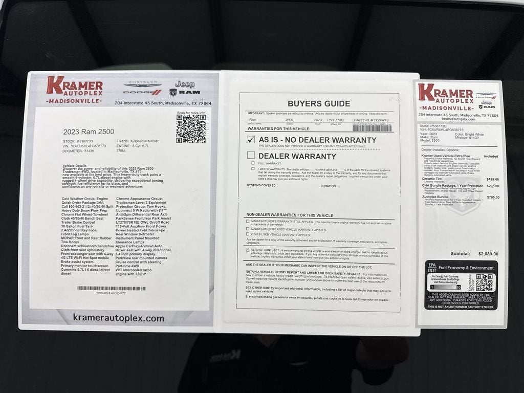 Cold Weather Group: Engine Block Heater; MOPAR Winter Front Grille Cover. Chrome Appearance Group: Bright Rear Bumper; Chrome Grille Surround; Matte Black Mesh Grille with Chrome; Center Hub; Chrome Headlamp Bezels; 18" Steel Spare Wheel; 18" X 8.0" Steel Chrome Clad Wheels; Bright Front Bumper. Quick Order Package 2HA Tradesman. Tradesman Level 2 Equipment Group: SiriusXM Radio Service; SiriusXM Satellite Radio; Cloth 40/20/40 Bench Seat; Rear Window Defroster; Power Heated Folding Telescope Mirrors; For More Info. Call 800-643-2112; 40/20/40 Split Bench Seat; Rear Power Sliding Window; Exterior Mirrors with Supplemental Signals; Exterior Mirrors Courtesy Lamps; Manual Folding Exterior Mirrors; Rear Folding Seat; 4 Way Front Headrests; Front Armrest with Cupholders; Exterior Mirrors with Heating Element; Manual Adjust 4-Way Driver Seat; Manual Adjust 4-Way Front Passenger Seat; Mirror Running Lights; Manuarl Telescoping Mirrors; Power Adjust Mirrors; Black Exterior Mirrors; 2 Way Rear Headrest Seat; MOPAR Front and Rear Rubber Floor Mats; Power Adjustable Convex Aux Mirrors. Protection Group: Tow Hooks; Transfer Case Skid Plate Shield. Heavy Duty Snow Plow Prep Group: Transfer Case Skid Plate Shield; 220 Amp Alternator. Uconnect 5 W Radio with 8.4" Display. Chrome Flat Wheel-To-wheel Side Steps. Anti-Spin Differential Rear Axle. Cloth 40/20/40 Bench Seat. ParkSense Front/rear Park Assist System. Trailer Brake Control. LT275/70R18E OWL On/off Road Tires. 50 Gallon Fuel Tank. 115-Volt Auxiliary Front Power Outlet. 2 Additional Key Fobs. Power Heated Fold Telescope Mirrors. Front Fog Lamps. Rear Window Defroster. MOPAR Front and Rear Rubber Floor Mats. Instrument Panel Mounted Auxiliary Switches. Tow Hooks. Clearance Lamps. **Equipment listed is based on original vehicle build and subject to change. Please confirm the accuracy of the included equipment by calling the dealer prior to purchase.**