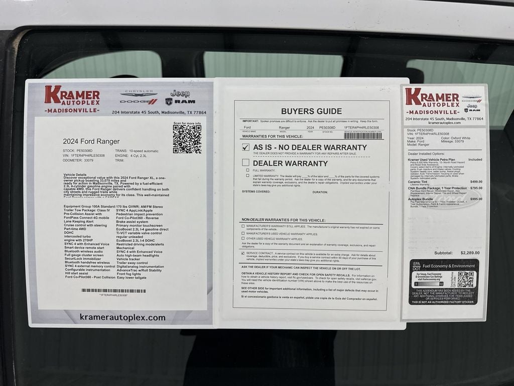 Discover exceptional value with this 2024 Ford Ranger XL, a one-owner pickup boasting 33,079 miles and ready for action in Madisonville, TX. Powered by a fuel-efficient 2.3L 4-cylinder gasoline engine paired with capable 4WD, this Ford Ranger delivers confident handling on both city streets and rugged trails while maintaining impressive economy for its class. This well-maintained Ford Ranger comes with a CARFAX 1-Owner history, giving you added peace of mind about its background and care. The interior features modern connectivity with Apple CarPlay and Android Auto, keeping your navigation, music, and communication seamlessly integrated on the go. Enjoy the convenience of remote start for quick climate control before you climb in, and rely on the back-up camera for safer, easier maneuvering in crowded parking lots or tight job sites. Practical, dependable, and affordably priced, this 2024 Ford Ranger XL represents the best price available for its condition and features in the area. Whether you need a work-ready truck, a weekend adventurer, or a practical daily driver, this Ford Ranger strikes a strong balance of capability and comfort. Visit Madisonville, TX to inspect and test drive this versatile pickup and see why it's a smart buy for drivers seeking performance, technology, and value in a dependable package.