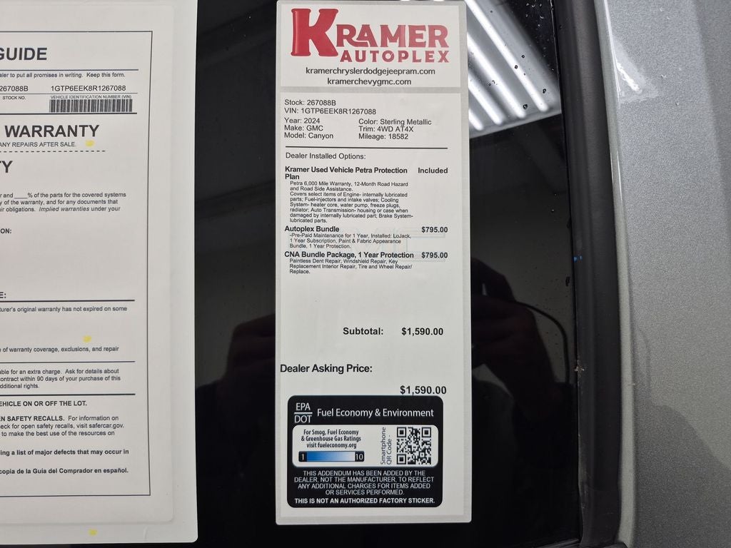 Apple CarPlay: Seamless smartphone integration for this 2024 GMC Canyon - stay connected and entertained on the go! This model has automated speed control that adjusts to maintain a safe following distance, enhancing highway driving convenience. The installed navigation system will keep you on the right path. Lane Keep Assist in this vehicle helps maintain safe driving by gently steering to stay within the lane. An off-road package is installed on this small pickup so you are ready for your four-wheeling best. Our dealership has already run the CARFAX report and it is clean. A clean CARFAX is a great asset for resale value in the future. Protect this small pickup from unwanted accidents with a cutting edge backup camera system. This model warns of approaching vehicles with Cross-Traffic Alert. This 2024 GMC Canyon features a high end BOSE stereo system. The GMC Canyon's Lane Departure Warning helps keep you in your lane.
