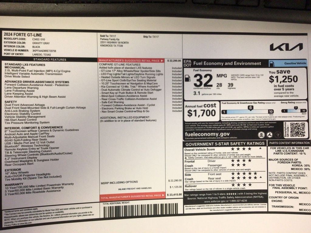 Find exceptional value with this 2024 Kia Forte GT-Line, a sleek, sporty sedan located in Livingston, TX. With only 27,782 miles, this low-mileage Kia Forte pairs a responsive 2.0L 4-cylinder gasoline engine with efficient front-wheel drive for balanced performance and fuel economy. The GT-Line trim adds refined styling and driving dynamics that stand out in the compact segment. Safety and convenience are prioritized with advanced Collision Avoidance to help protect you and your passengers on Texas roads. Technology features include a built-in Navigation system for stress-free routing, seamless Android Auto integration to keep your smartphone connected, and a Back-Up Camera to simplify parking and tight maneuvers. Hands-Free Bluetooth® lets you manage calls and media without taking your hands off the wheel. This Kia Forte GT-Line delivers a premium feel with sporty accents, comfortable seating, and thoughtful tech that enhances everyday driving. Whether commuting, road-tripping, or running errands around Livingston, this vehicle offers the right combination of performance, safety, and modern connectivity. Priced to sell, this car represents the best price available for its condition and features—an opportunity to own a high-value compact sedan with low mileage. Schedule a test drive in Livingston, TX today and experience why this 2024 Kia Forte GT-Line is a smart, budget-savvy choice.