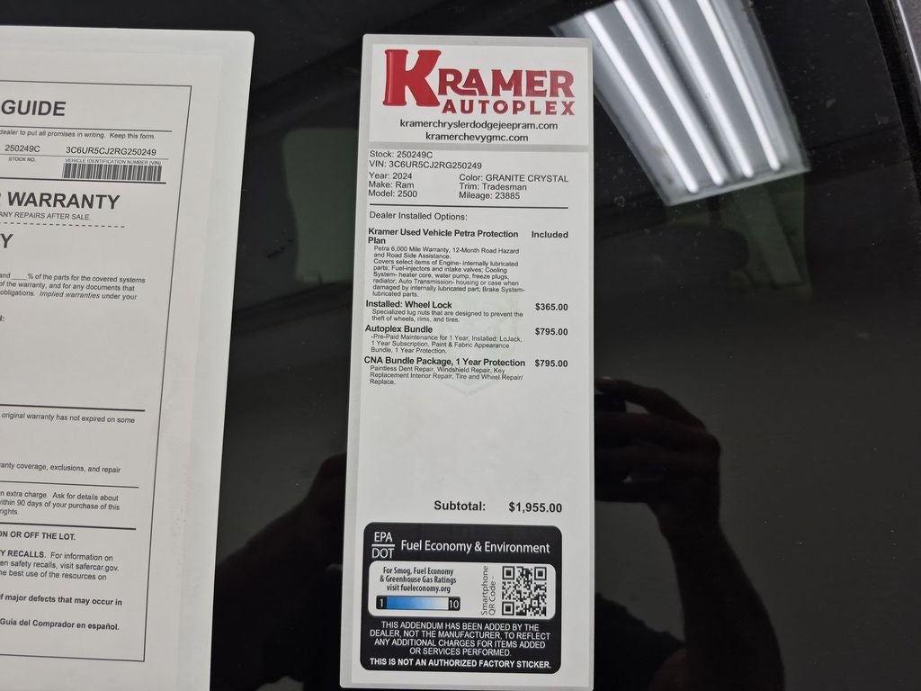 Discover this rugged 2024 Ram 2500 Tradesman with only 23,885 miles — a low-mileage powerhouse ready for work or adventure in Livingston, TX. Equipped with a stout V8 6.4L gasoline engine and reliable 4WD, this truck delivers the torque and towing capability you need for heavy-duty tasks while maintaining comfortable daily drivability. This Tradesman comes CARFAX 1-Owner certified, giving you added confidence in its history. Technology and convenience features include Android Auto for seamless smartphone integration, hands-free Bluetooth® for safe calling, built-in navigation to keep you on course, and a back-up camera to simplify parking and hitching trailers. The interior is practical and designed for durability, while the exterior shows the solid build expected from Ram. We're offering the best price on this 2024 Ram 2500 Tradesman in the area — an exceptional value for a low-mileage, one-owner work truck with premium features. Whether you're hauling equipment, towing trailers, or tackling off-road jobs around Livingston, TX, this 4WD V8 Ram is ready to perform. Contact us today to schedule a test drive or request the CARFAX report. Don't miss your chance to own a powerful, dependable truck at the best price in the region.